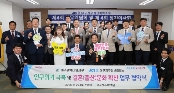 대구 달서구(구청장 이태훈)는 지난 29일 대구지구청년회의소(회장 이성범)와 초저출생 인구 위기 극복 및 긍정적 결혼문화 확산을 위한 업무협약을 체결했다.