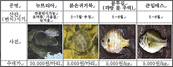 이에 대구 북구청에서는 금호강, 저수지 등에 서식하고 있는 생태계 교란종에 대하여 배스·블루길 kg당 5,000원, 붉은귀거북 마리당 5,000원, 뉴트리아 마리당 20,000원에 수매할 예정으로 2019년 4월 3일(수)부터 보상금 예산 소진 시까지 매주 수요일 오전(09:30~11:30)에 북구청 주차장에서 수매사업을 진행한다.