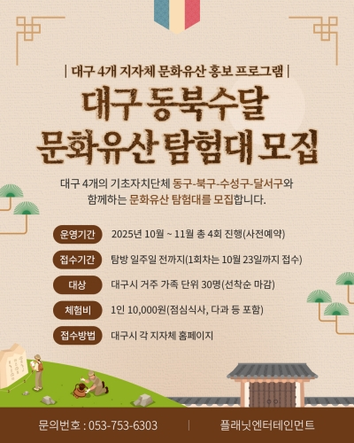 배광식 북구청장은 “이번 사업은 대구 4개 기초자치단체 업무협약을 토대로 시행되는 첫 번째 공동사업으로, 많은 시민들이 참여해 대구 전역에 산재한 국가유산을 돌아보며 우리 지역의 역사적 가치를 폭넓게 이해하는 소중한 시간이 될 수 있기를 바란다.”고 말했다.