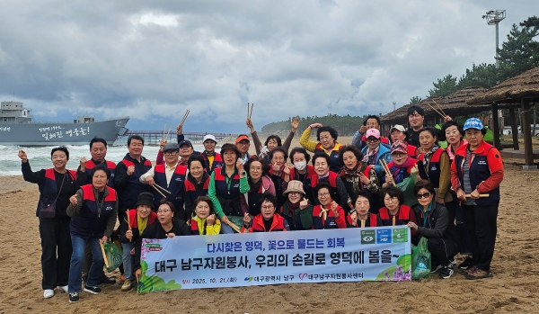 대구 남구(구청장 조재구)는 지난 10월 21일 대구남구자원봉사센터(센터장 이창지)와 함께 자원봉사자 40명이 올해 3월 대형 산불 피해를 겪은 경북 영덕지역에서 재난대응 중심 봉사활동을 펼쳤다.