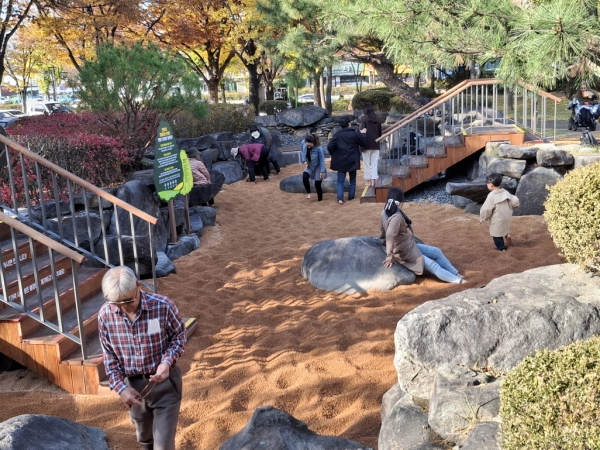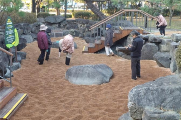 이번 ‘맨발 걷기 힐링장’은 수성못 솔숲광장 내 수경시설 유휴 공간과 범어동 야시골공원 내 노후 체육시설 공간을 활용해 예산 절감은 물론 도심 속에서 자연을 느끼며 휴식할 수 있는 ‘신체와 마음의 치유 공간’으로 마련됐다.