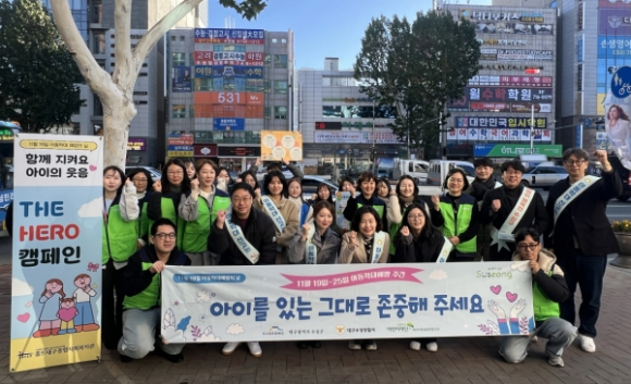 대구 수성구(구청장 김대권)는 ‘아동학대예방의날(11. 19.)’과 ‘아동학대예방 주간(11. 19. ~ 11. 25.)’을 맞아 아동학대 예방과 인식 개선을 위한 민·관·경 합동 캠페인을 실시했다.