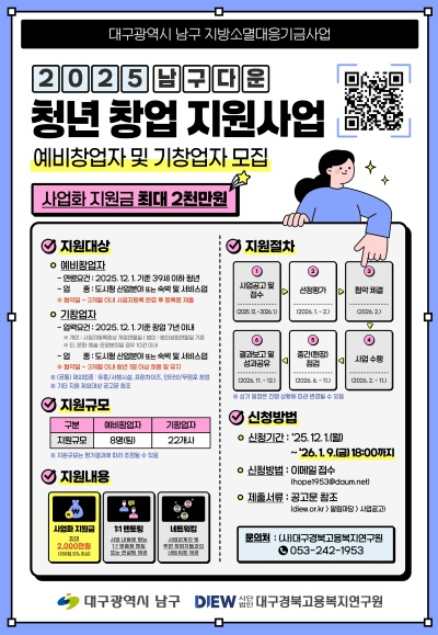 대구 남구(구청장 조재구)는 지역 청년들의 안정적인 창업 활동과 지역 상권 활성화를 도모하기 위해 ‘청년창업지원 2차 사업’을 추진하고, 2026년 1월 9일까지 참가자를 모집한다.