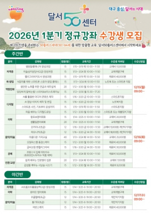 대구 달서구(구청장 이태훈)는 12월 15일부터 24일까지 ‘2026년 1분기 달서50플러스센터 정규강좌’ 수강생을 선착순 모집한다.