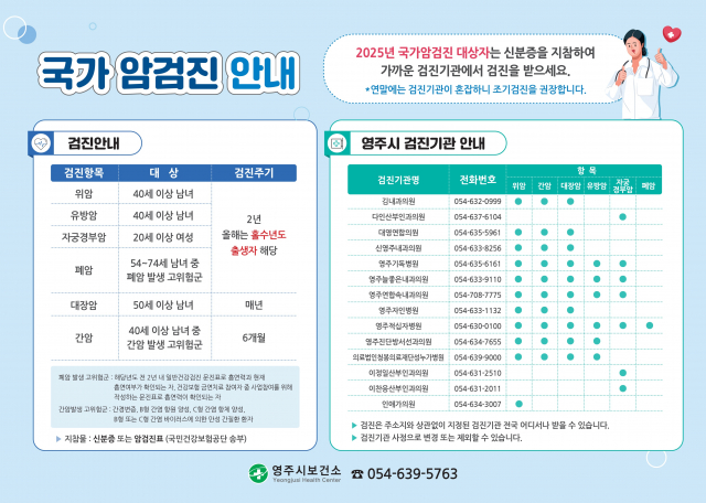 국가암검진 및 암환자의료비지원사업에 대한 자세한 사항은 영주시 보건소(☎054-639-5763)로 문의하면 된다.
