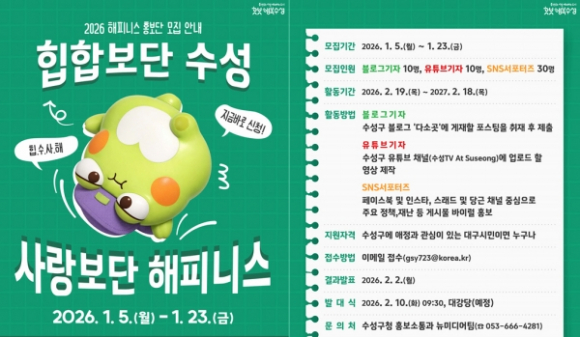 대구 수성구(구청장 김대권)는 주민이 직접 참여하는 소통 중심의 구정 홍보를 확대하기 위해‘2026년 해피니스 홍보단’을 이달 5일부터 23일까지 모집한다.