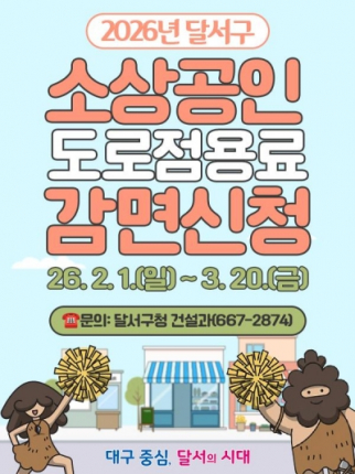 대구 달서구(구청장 이태훈)는 경기침체로 어려움을 겪고 있는 소상공인의 경제적 부담을 완화하기 위해, 2026년도 도로점용료를 25% 감면한다고 28일 밝혔다.