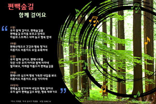 노래 「편백숲길 함께 걸어요」는 ‘우리 함께 걸어요 편백숲길을’, ‘편백나무 우리 아이와 함께 자라네’라는 가사를 통해 구민이 함께 걷고, 심고, 키워가는 공동체의 미래를 따뜻하게 표현했다. 후렴구에는 ‘편백산책으로 건강과 행복 챙겨요’, ‘피톤치드 우릴 유혹하네’라는 메시지를 경쾌한 리듬에 담아, 편백숲이 주는 상쾌함과 치유의 가치를 자연스럽게 전달한다.