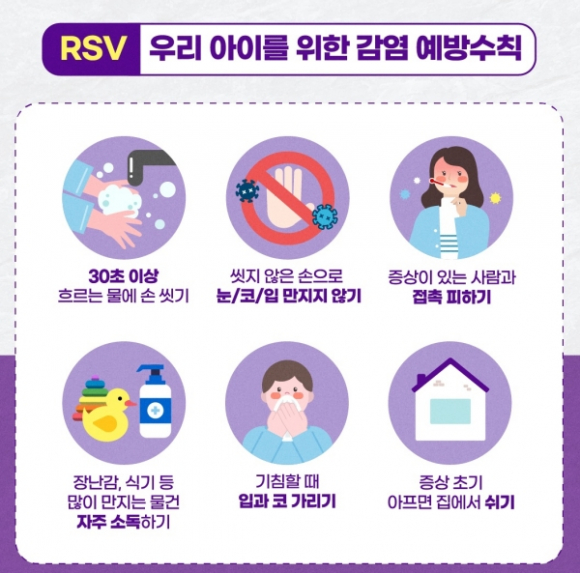 현재 RSV 감염증은 별도의 치료제가 없어 대부분 증상 완화 중심의 대증요법으로 치료된다. 호흡곤란이나 수유량 감소, 청색증 등 중증 증상이 나타날 경우 즉시 의료기관을 방문해야 하며, 보호자는 영·유아의 상태를 세심하게 관찰하고 가정 내 예방관리에 유의해야 한다.