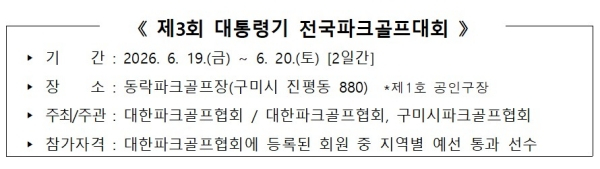 대통령기 전국파크골프대회는 대한파크골프협회가 주최하는 전국 규모의 공식 대회로, 올해로 3회째를 맞는 파크골프 최고 권위 대회다.