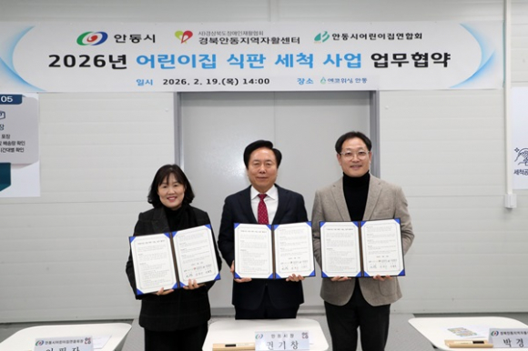 안동시는 2월 19일(목) 2026년 어린이집 식판 세척사업의 원활한 추진을 위해 경북안동지역자활센터, 안동시어린이집연합회와 업무협약을 체결했다.
