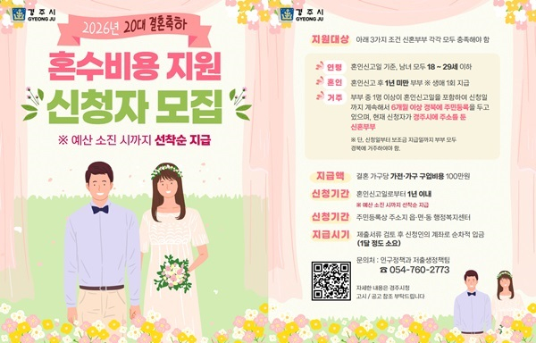 경주시는 청년층의 결혼 초기 경제적 부담을 완화하고 안정적인 가정 정착을 지원하기 위해 ‘2026년 20대 결혼 축하 혼수비용 지원사업’을 시행한다고 24일 밝혔다.