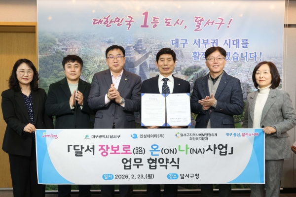 대구 달서구(구청장 이태훈)는 23일 인성데이타(주)(대표 최현환), 달서구지역사회보장협의체 희망복지분과(분과장 최안집)와 함께 거동이 불편한 중장년 1인 장애인 세대 등을 대상으로 온라인 장보기 지원을 위한 업무협약을 체결했다.