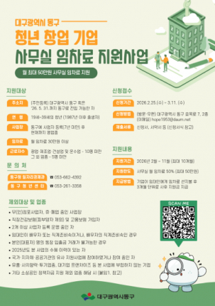 대구 동구청(구청장 윤석준)은 지역 내 청년 창업가들의 초기 경영 부담을 완화하고 안정적인 사업 환경을 조성하기 위해 ‘2026년 청년 창업기업 사무실 임차료 지원사업’을 추진한다.