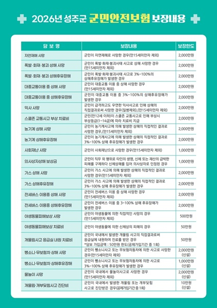 군민안전보험은 성주군에 주민 등록을 둔 군민이면 별도로 가입하거나 보험료 납입 없이 자동으로 가입되며 개인이 가입한 타 보험과 별도로 중복 보상이 가능하다.