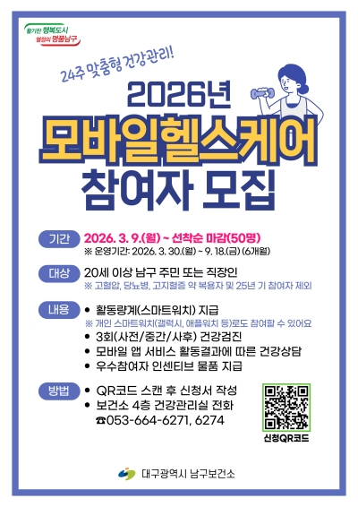 대구 남구보건소는 오는 3월 9일부터 18일까지 지역주민의 효과적인 건강관리를 위해 ‘2026년 모바일 헬스케어 사업’ 신규참여자 50명을 모집한다고 밝혔다.
