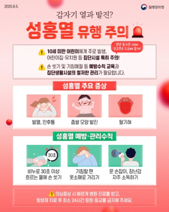 ○ 성홍열의 주요 증상 및 전파 경로성홍열은 A군 베타 용혈성 연쇄구균에 의한 급성 발열성 질환으로, 주로 5~15세 연령대에서 발생한다. 갑작스러운 발열, 인후통, 두통으로 시작해 12~48시간 후 전신에 선홍색의 작은 발진이 나타나는 것이 특징이다. 특히 혓바닥이 빨갛고 오톨도톨해지는 ‘딸기 모양 혀’ 현상이 동반되기도 한다.