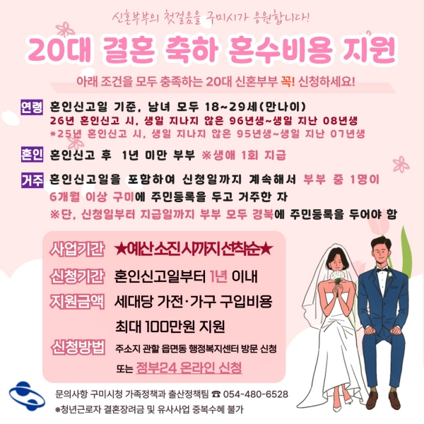 예식 이후 초기 정착을 위한 지원도 병행한다. ‘청년근로자 결혼장려금 지원’ 사업을 통해 25년 이후 혼인신고를 한 구미 거주·근로 청년 400가구에 카드형 구미사랑상품권 100만 원을 지급한다. 경제적 기반이 상대적으로 취약한 20대를 위한 맞춤형 정책도 마련됐다. ‘20대 결혼축하 혼수비용 지원’ 사업은 혼인신고일 기준 부부 모두 20대이면서 혼인신고 후 1년이 지나지 않은 신혼부부가 대상으로 총 84가구를 선정해 혼수 마련 비용 100만 원을 지원한다.