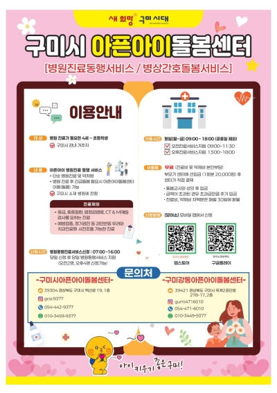 이용 대상은 구미시에 주소를 둔 맞벌이 등 양육 공백 가정의 4세 이상 유아와 초등학생이다. 이용료는 무료이며, 병원 진료비와 약제비만 보호자가 부담한다.