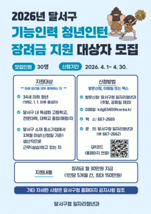 대구 달서구(구청장 이태훈)는 지역 청년의 취업을 촉진하고 관내 중소기업의 인력난 해소를 위해‘2026년 기능인력 청년인턴 장려금 지원사업’ 참여자를 모집한다.