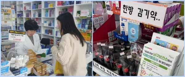 | ↑↑ (좌)남구 치매안심약국 약사가 치매안심센터 직원의 설명을 듣고 있는 모습. (우) 치매안심약국 내 치매관리사업 안내문 비치 사진 |