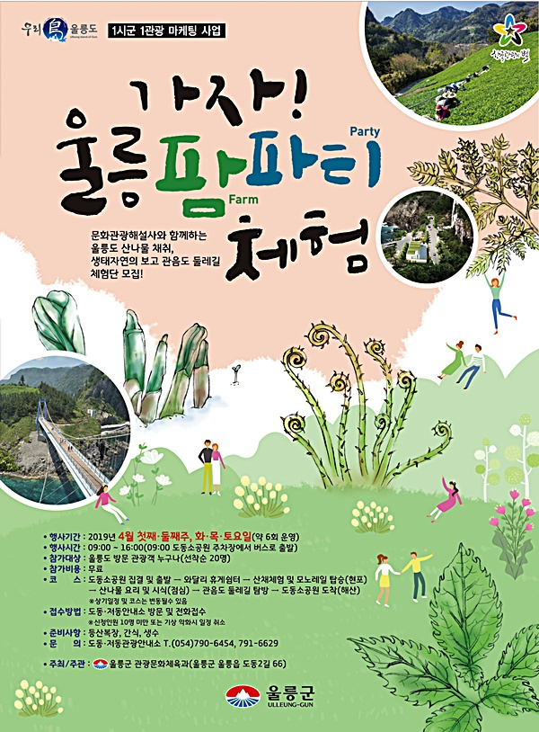 울릉군은 오는 4월 1주~2주 매주 화, 목, 토 울릉도를 방문하는 개인 및 가족단위 관광객을 대상으로 산나물 채취 체험프로그램을 실시한다고 밝혔다.