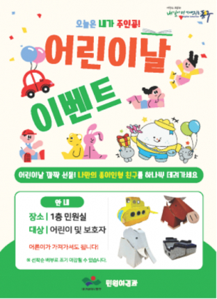 대구 동구청은 어린이날을 맞아 민원실을 방문하는 어린이들에게 DIY교구를 증정하는 이벤트를 진행한다.