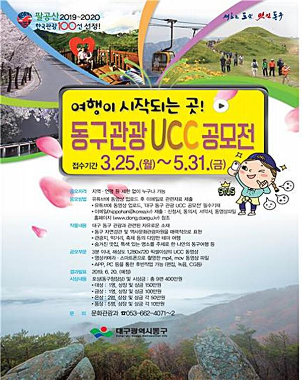 대구 동구청(구청장 배기철)은 한국인이 꼭 가봐야 할, 2019-2020년 ‘한국관광 100선’에 ‘동구 팔공산’이 선정된 것을 기념하여 영남의 명산 ‘팔공산’의 브랜드 가치를 높이고 동구 관광의 매력을 알리기 위해 관광 수요자가 직접 참여하는 동구 관광 UCC 공모전을 개최한다.
