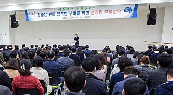 구미시(시장 장세용)는 지난 2일~3일 양일간 4회에 걸쳐 새마을운동테마공원 글로벌관 다목적홀에서 전직원을 대상으로 공직자 마인드 전환을 위한 친절교육을 실시했다.