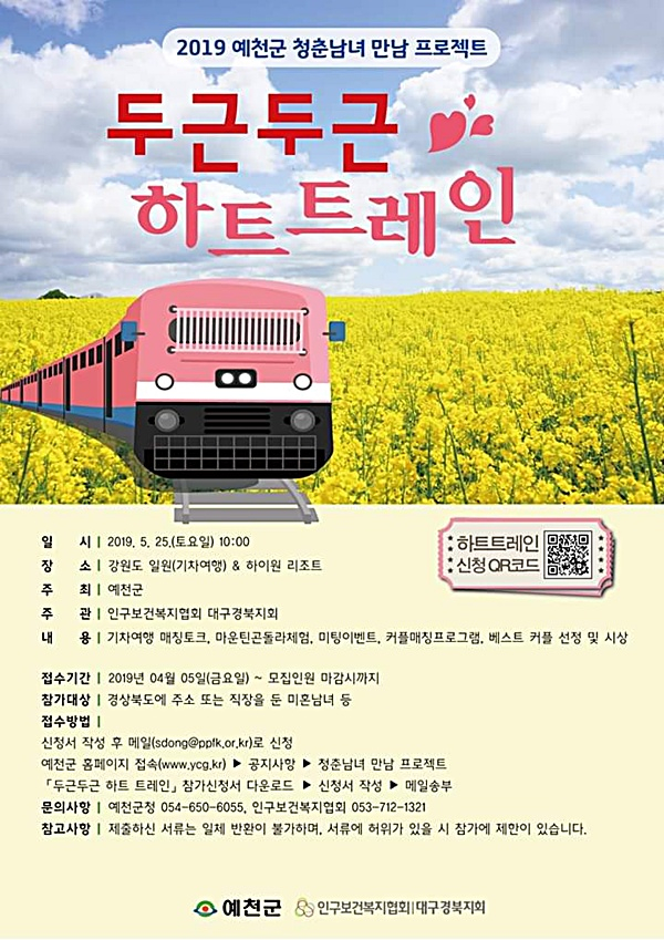 한편, 예천군은 인구시책으로 결혼친화 분위기 조성을 위해 청춘 남녀 만남행사인 ‘두근두근 하트 트레인’을 오는 5월 25일 개최할 계획으로 행사 참가 신청은 예천군 홈페이지 배너 및 공지사항에서 확인할 수 있다. (참가문의 : 054-650-6055, 예천군청 기획 감사실) [시군향우회인터넷뉴스=정미진기자]