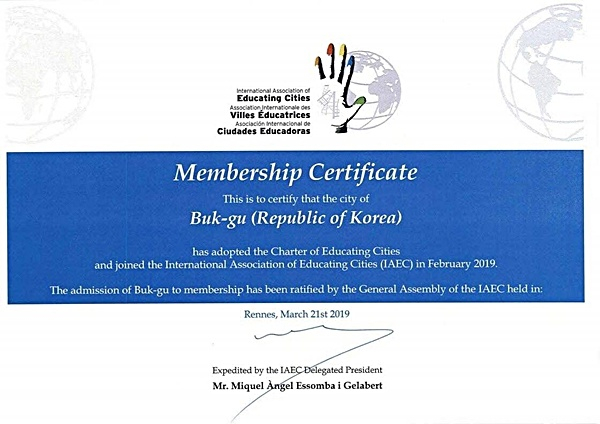 대구광역시 북구(구청장 배광식)는 지난 2월 14일 스페인 바르셀로나에 본부가 있는 국제교육도시연합 사무국으로 가입신청서를 보내어, IAEC 자격심사를 거쳐 지난 3월 21일 프랑스 총회에서 최종 승인되어 정식 회원 도시로 가입됐다.