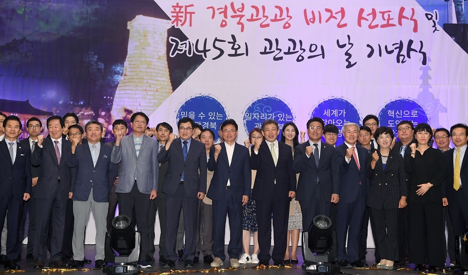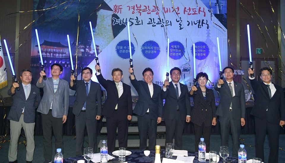 경상북도와 경북관광협회는 27일(목) 경주 현대호텔에서 관광업계 대표, 관광종사자, 문화관광해설사, 시군 관광담당공무원 등 500여명이 참석한 가운데 ‘신(新) 경북관광 비전 선포식 및 제45회 관광의 날’기념식을 가졌다.