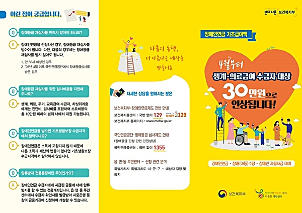 구미시(시장 장세용)에서는 개정된 장애인연금법 시행에 따라 오는 20일부터 기존 25만원이던 장애인연금의 기초급여액을 수급자격에 따라 최대 30만원(생계·의료수급자 25만원→30만원, 주거·교육·차상위 25만원→25만3750원)까지 증액 지급한다.