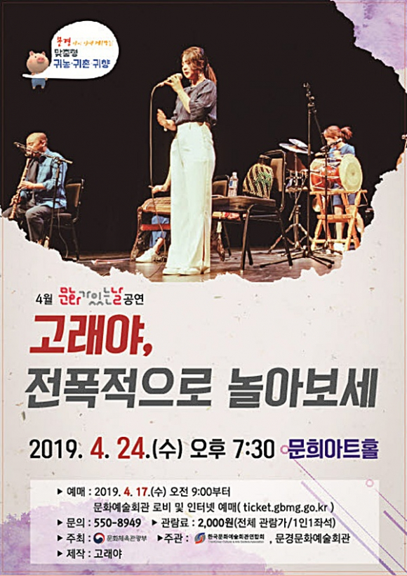 4월 문화가 있는 날(매월 마지막 수요일이 있는 주)을 맞이하여 국악·월드뮤직 그룹 ‘고래야’의 ‘고래야, 전폭적으로 놀아보세’ 공연이 오는 24일 저녁7시30분에 문희아트홀에서 열린다.