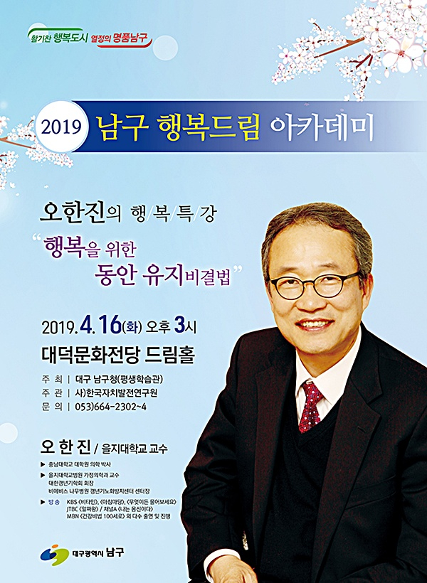 대구광역시 남구청(구청장 조재구)은 오는 16일 오후 3시, 대덕문화전당 드림홀에서 가정의학과 전문의이자 의학박사인 오한진 교수를 초빙하여 ‘남구 행복드림 아카데미’를 개최한다.