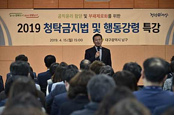 대구광역시 남구청(구청장 조재구)은 지난 15일 4층 회의실에서 공직윤리 함양 및 부패제로화를 위해 청탁금지법 및 행동강령 특강을 실시했다.