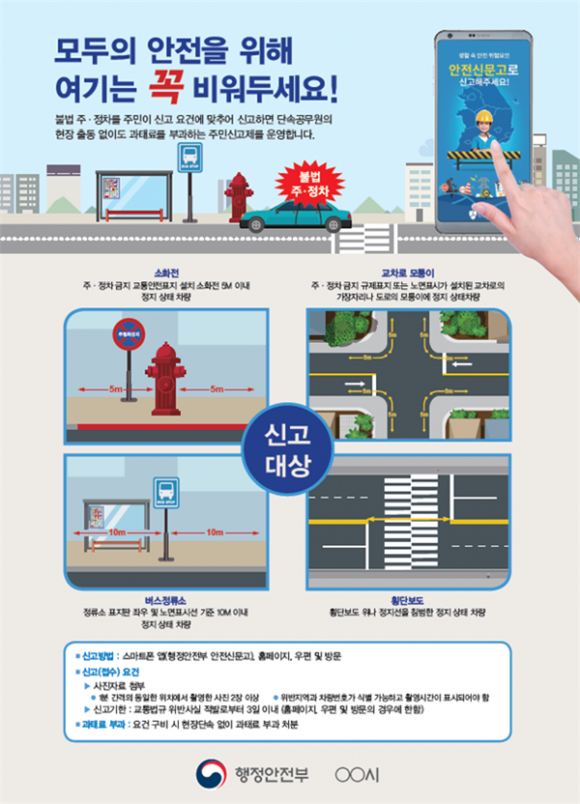 행정안전부가 4대 불법 주·정차 관행을 뿌리 뽑기 위해 ‘주민 신고제’를 지난 17일부터 본격 시행했다.