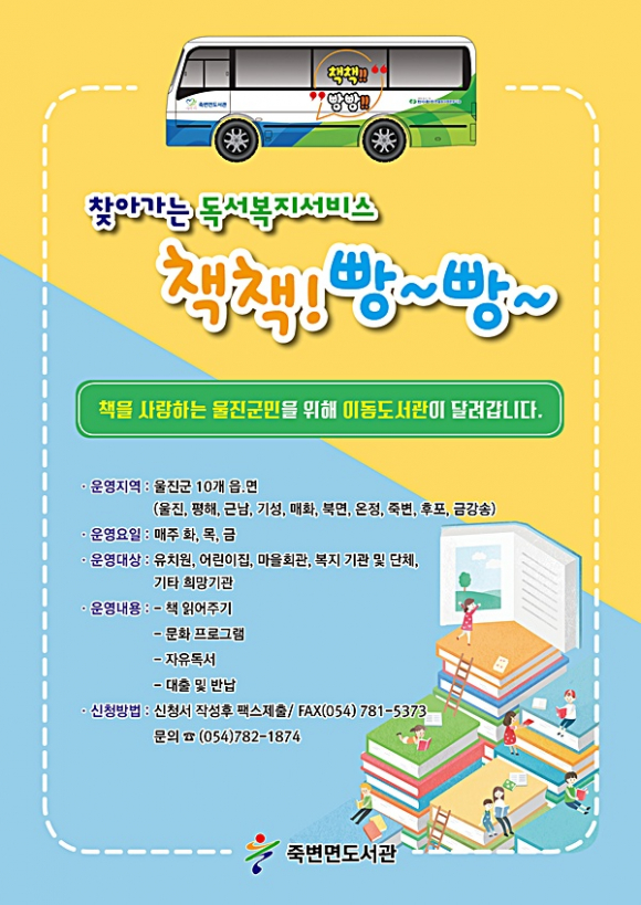 ‘책책빵빵’ 이동도서관의 방문을 희망하는 기관 및 단체는 울진군 통합도서관 홈페이지(https://lib.uljin.go.kr)에서 참가 신청서를 작성해 팩스(☎ 054-781-5373) 또는 죽변면도서관(☎ 054-782-1874)을 방문하여 신청할 수 있다. [시군향우회인터넷뉴스=정미진기자]