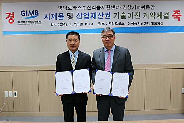 영덕로하스수산식품지원센터는(센터장 김명욱 박사) 지난 19일 영덕로하스수산식품지원센터 대회의실에서 김창기머쉬룸팜(대표 김창기)과 영덕로하스수산식품지원센터 직원이 참석한 가운데 ‘시제품 및 산업재산권 기술이전 계약’을 체결했다.
