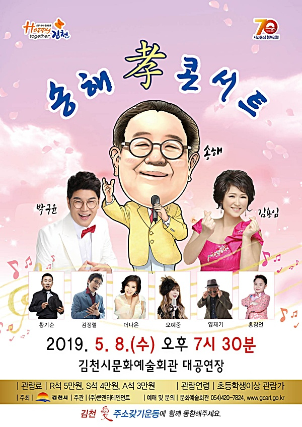 김천시문화예술회관(관장 김금숙)에서는 5월 가정의 달을 맞이하여 가족의 중요성과 효의 의미를 되새기고자 오는 5월 8일 오후 7시 30분에 어버이날 기념 특별공연 ‘송해 孝 콘서트’를 대공연장에서 개최한다.