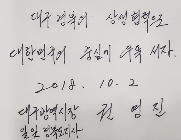 권영진 시장과 이철우 지사는 집무실에서 ‘시·도지사 상호 교환근무 추진 계획’ 결재를 시작으로 현안보고에 이어, 의회를 방문하여 확대의장단과 환담을 실시하고 기자실을 찾아 방문소회를 밝혔다.