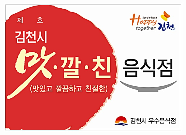 김천시(시장 김충섭)은 올해 처음으로 김천의 맛과 멋을 담고 있으면서 ‘Happy together 김천운동’을 실천하는 ‘김천시 맛·깔·친 우수음식점’을 선정한다고 밝혔다.