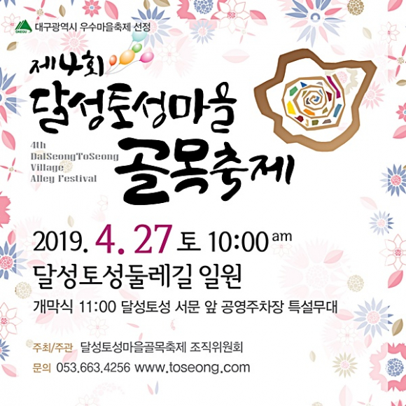 달성토성마을 골목축제는 대구광역시 선정 우수마을축제로 올해 제4회를 맞이했다. 오는 27일 10시 퍼레이드와 서부초등학교 취타대 공연을 시작으로 11시에 달성토성 서문 앞 공영주차장 특설무대에서 개막식을 갖는다.