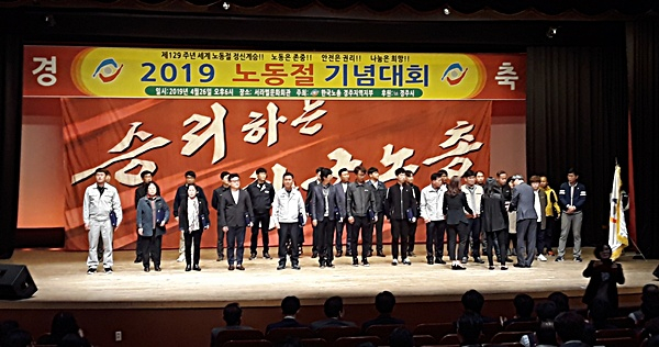 경주시는 제129주년 세계노동절 및 2019년 근로자의 날 기념행사를 지난 26일 서라벌문화회관에서 한국노총경주지부(의장 윤석주) 주관으로 개최했다.