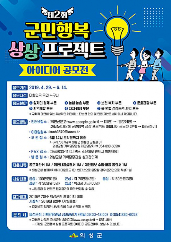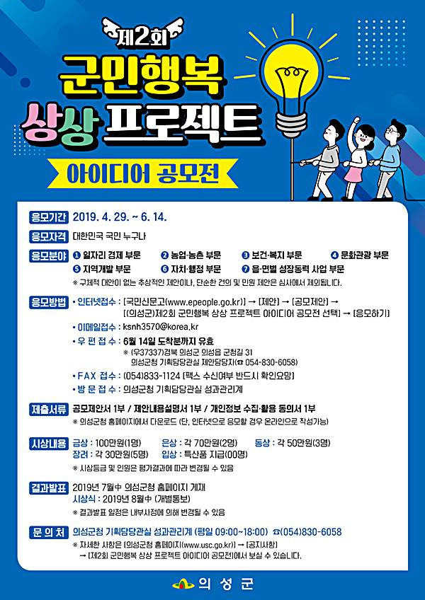 의성군(군수 김주수)은 ‘제2회 군민행복 상상 프로젝트’ 아이디어 공모전을 개최한다.
