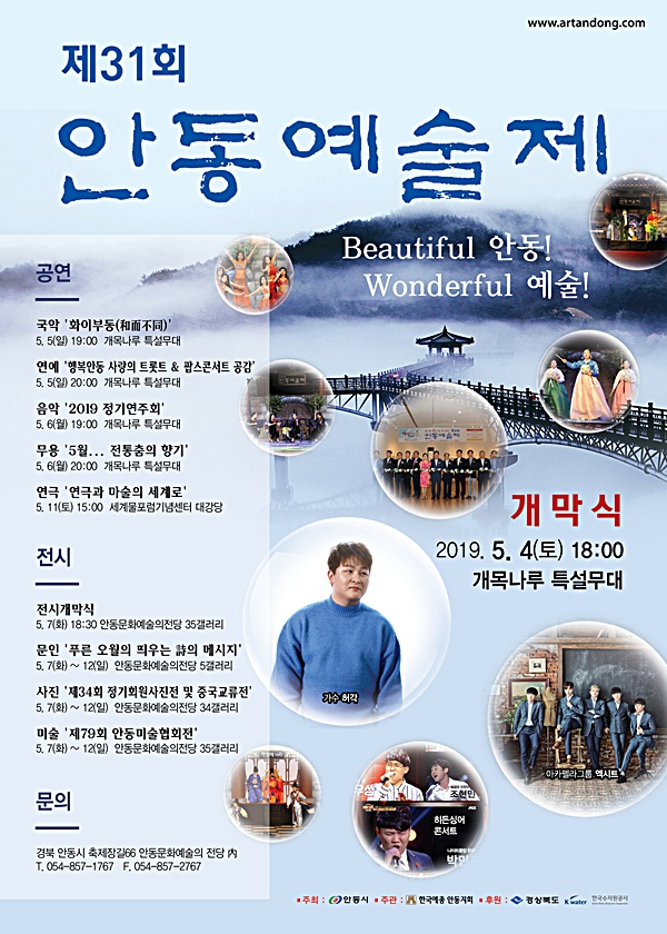 뷰티풀(Beautiful) 안동! 원더풀(Wonderful) 예술! ‘제31회 안동예술제’가 안동예총 산하 8개 단체가 참여한 가운데 5월 4일 토요일 저녁 6시 안동댐 개목나루 특설무대에서 개최된다.