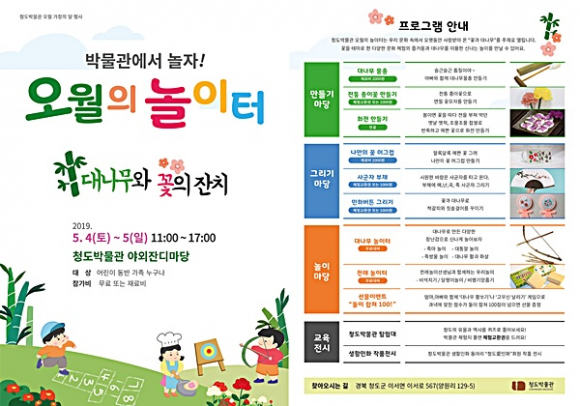 청도군(군수 이승율)은 이서면 양원리 청도박물관 잔디마당에서 오월 가정의 달을 맞아 5월4일부터 5일까지 양일간 ‘청도박물관, 오월의 놀이터 - 꽃과 대나무의 잔치’ 행사를 개최한다.