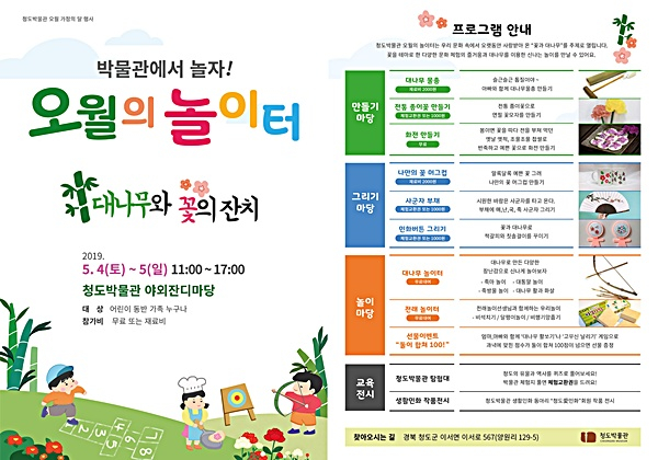청도박물관 ‘오월의 놀이터’ 행사는 자라나는 어린이들에게 우리 전통문화와 전래놀이를 체험해 볼 수 있도록 기획되었다. 올해 오월의 놀이터 주제는 우리 문화 속에 아름다운 꾸밈과 다양한 쓰임의 제제인 꽃과 대나무를 테마로 꾸려졌다.
