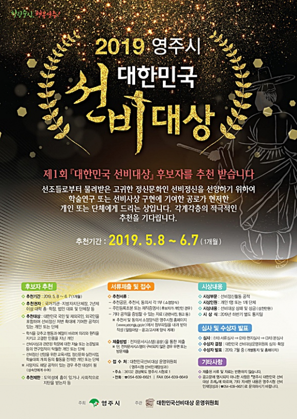 기타 자세한 사항은 대한민국선비대상 운영위원회(영주시 선비인재양성과 ☎054-639- 6621)로 문의 하면 된다. [시군향우회인터넷뉴스=정미진기자]