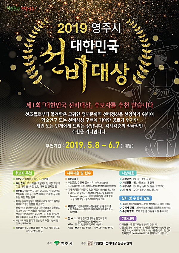 경북 영주시(시장 장욱현)는 선조들로부터 물려받은 고귀한 정신문화인 선비정신을 선양하기 위해 ‘제1회 대한민국 선비대상’ 후보자를 공모한다.